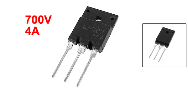 Product Name NPN Transistor Model No. C5002 Mounted Type Through Hole Collector Current 4A Collector Emitter Voltage 700V Mounting Hole Diameter 2.9mm / 0.1" Pin Length 20mm/ 0.79" Total Size 41 x 15 x 5mm /1.61" x 0.59" x 0.2" (L*W*H) Main Material Silicon Main Color Black, Silver Tone Weight 5g Package 1 x NPN Transistor - Reviews