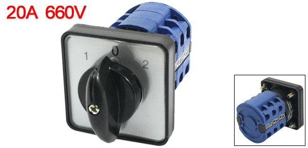 Positions 3Positions (1-0-2) Action Type Latching Terminal Number 12 Pole Numbers 3Poles Panel Mount Size 50 x 50 x 10mm/ 2" x 2" x 0.4"(L*W*T) Body Size 44 x 36 x 47mm / 1.7" x 1.4" x 1.9"(L*W*T) Mounting Hole Dia. 3.5mm/0.14" Total Height 76mm/ 3" External Material Plastic Color Blue, Black Weight 120g Package Content 1 x Cam Changeover Switch
