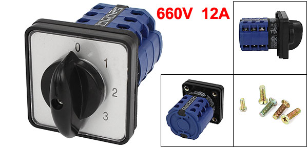 Positions 4 Positions(0-1-2-3) Terminal Number 12 Pole Numbers 3 Poles Panel Mount Size 5x 5x 1cm/ 2" x 2" x 0.4"(L*W*T) Body Size 4.5 x 3.5x 4.2cm / 1.8" x 1.4" x 1.7"(L*W*T) Total Height 7.5cm/ 3" Mounting Hole Dia. 0.5cm/0.2" External Material Plastic Main Color Black, Blue Weight 109g Package Content 1 x Universal Changeover Switch