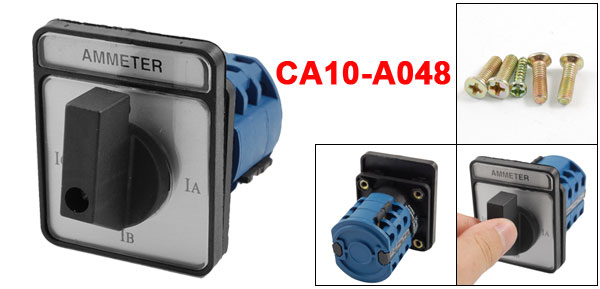 Product Name Ammeter Switch Model No. CA10-A048 Voltage AC380-440V, AC660V, DC220-240V AC21 Ith 20A AC1 16A/AC 380V, 12A/AC 660V Installing Holes Dia 3.5mm/0.14'' Installing Size 37 x 37mm / 1.417" x 1.417"(L*W) Overall Size 61 x 50 x 81mm/2.4'' x 2'' x 3.2'' (L*W*H) External Material Plastic Color Blue, Black Net Weight 107g Package Content 1 x Ammeter Switch