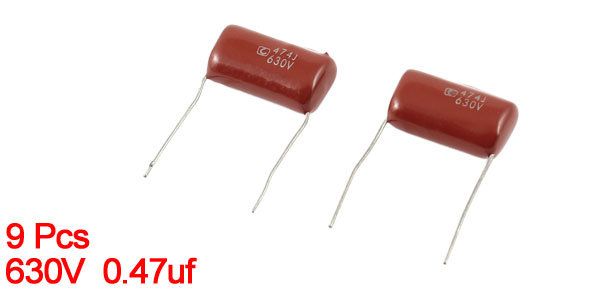 Product Name Metallized Polypropylene Film Capacitor Model No. CBB21 Type Radial Lead Withstand Voltage 630V Capacitance 0.47uf (474J) Capacitance Tolerance ±5% Lead Spacing 22mm /0.87" Lead Size 22 x 1mm / 0.98" x 0.04" (L*D) Body Size 24 x 14 x 9mm / 0.94" x 0.55" x 0.35" (L*W*T) Dielectric Material Metallized Polypropylene Film Net Weight 29g Color Red Package Content 9 Pcs x Metallized Polypropylene Film Capacitors - Reviews