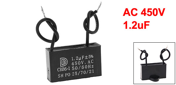 Product Name Motor Capacitor Model CBB6-1 External Material Plastic Dielectric Material Metalized Polypropylene Film Rated Capacitance 1.2uF Tolerance ±5% Rated Frequency 50/60Hz Rated Voltage AC 450V Body Size 3.7 x 2.2 x 2.2cm/ 1.456" x 0.87" x 0.87"(L*W*T) Fixing Hole Diameter 4mm/0.16" Cable Length 7cm/ 2.76" Net Weight 13g Package Content 1 x Motor Run Capacitor - Reviews