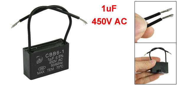 DetailsCBB6-1 1uF 450V AC Motor Run Metallized Capacitor  Product Name Motor Capacitor Model CBB61 Dielectric Material Metallized Polypropylene Film Terminal Wire Ambient Temperature(Max) 70°C Rated Capacitance 1uF Tolerance 5% Rated Frequency 50/60Hz Rated Voltage 450V AC Size 3.8 x 2.4 x 2.4cm/1.4" x 0.9" x 0.9"(L*W*T) Wire Length 7cm/ 2.7" Install Bore Diameter 0.5cm/ 0.2" Main Color Black Weight 17g Package Content 1 x Motor Capacitor