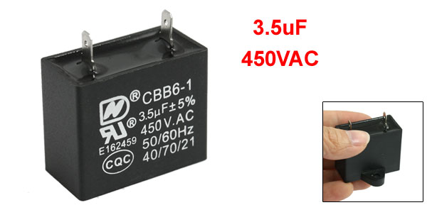 Product Name Motor Capacitor Housing Material Plastic Dielectric Material Metallized Polypropylene Film Model CBB6-1 Capacitance 3.5uF Tolerance ±5% Rated Voltage 450VAC Frequency 50/60Hz Temperature 40/70/21 Pin Spacing(Approx.) 2.3cm/0.9'' Overall Size 3.7 x 3 x 4cm/1.6'' x 1.2'' x 1.6'' (L*W*H) Color Black Weight 28g Package Content 1 x Motor Capacitor - Reviews