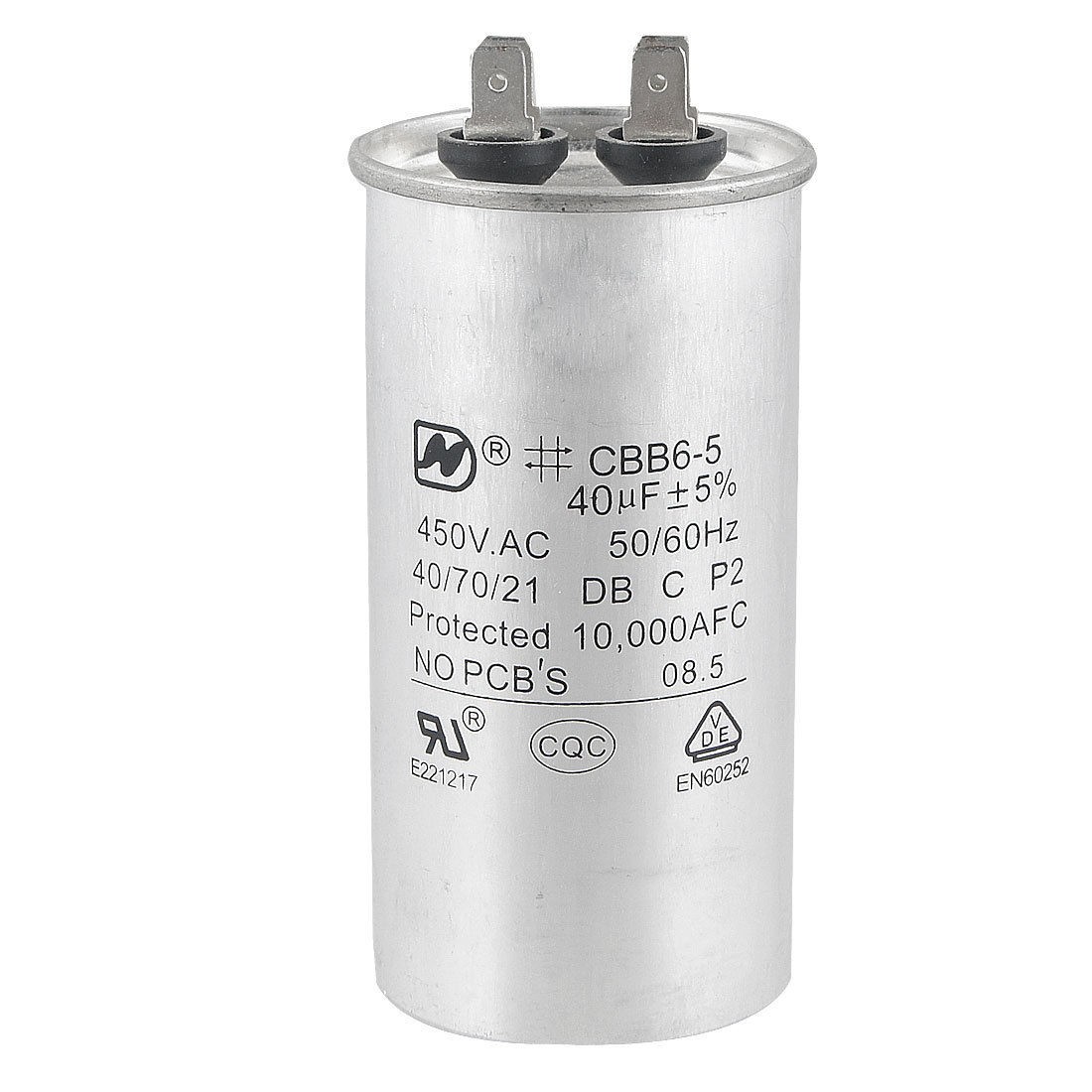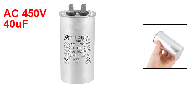 Product Name Motor Capacitor Material Polypropylene Model CBB6-5 Capacitance 40uF Rated Voltage AC 450V Tolerance +/-5% Body Dimension 5.3 x 10cm/ 2.1" x 4" (D*H) Total Length 11.4cm/ 4.5" Color Silver Tone Weight 208g Package Content 1 x Motor Capacitor - Reviews