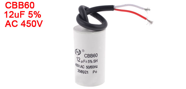 Product Name Motor Capacitor Housing Material Plastic Dielectric Material Metalized Polypropylene Model CBB60 Capacitance 12uF Tolerance ±5% Rated Voltage 450V AC Frequency 50/60Hz Body Size 7 x 4 x 4cm / 2.8" x 1.6" x 1.6" (L * W * T) Wire Length(Approx.) 19.5cm / 7.7" Color Blak, White Weight 107g Package Content 1 x Motor Capacitor - Reviews