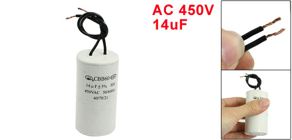 Product Name Motor Run Capacitor Model CBB60 Material Polypropylene Film Rated Capacitance 14uF Tolerance 5% Ambient Temperature 40/70/21 Rated Frequency 50/60Hz Rated Voltage 450V AC Cylinder Size 3.7 x 7.2cm / 1.4" x 2.8" (D*H) Lead Length 14cm / 5.5" Lead Dia. 0.2cm/ 0.078" Main Color White Weight 63g Package Content 1 x Motor Run Capacitor - Reviews