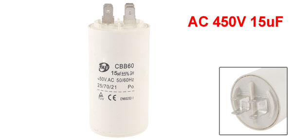 Product Name Motor Capacitor Housing Material Metal Dielectric Material Metallized Polypropylene Film Model CBB60 Capacitance 15uF Tolerance +/-5% Rated Voltage 450V AC Frequency 50/60Hz Body Dimension 3.8 x 7.2cm/ 1.5" x 2.8"(D * H) Operating Temperature 25/70/21 Color White Net Weight 90g Package Content 1 x Motor Capacitor - Reviews