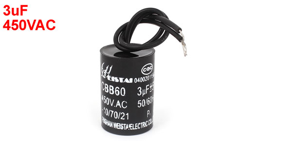 Product Name Motor Capacitor Housing Material Plastic Dielectric Material Metallized Polypropylene Film Model CBB60 Capacitance 3uF Tolerance ±5% Rated Voltage 450VAC Frequency 50/60Hz Cable Length 13cm/5" Body Dimension 2.6 x 3.9cm/1" x 1.5"(D * H) Net Weight 29g Package Content 1 x Motor Capacitor - Reviews