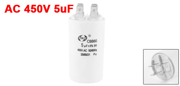 Product Name Motor Capacitor Housing Material Metal Dielectric Material Metallized Polypropylene Film Model CBB60 Capacitance 5uF Tolerance +/-5% Rated Voltage 450V AC Frequency 50/60Hz Body Dimension 3.2 x 6.2cm/ 1.3" x 2.4"(D * H) Operating Temperature 25/85/21 Color White Net Weight 68g Package Content 1 x Motor Capacitor - Reviews