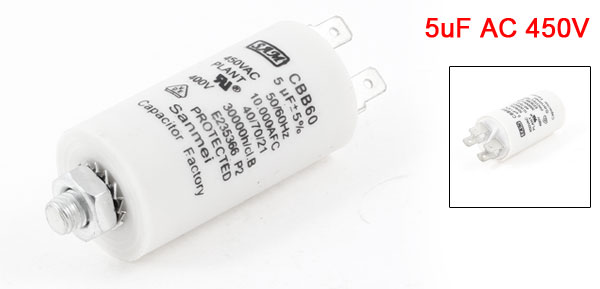Product Name Motor Capacitor Material Polypropylene Film Model CBB60 Capacitance 5uF Tolerance +/-5% Rated Voltage AC 450V Frequency 50/60Hz Body Size 30 x 55mm/ 1.2" x 2.2" (D * H) Color White Weight 50g Package Content 1 x Motor Capacitor - Reviews