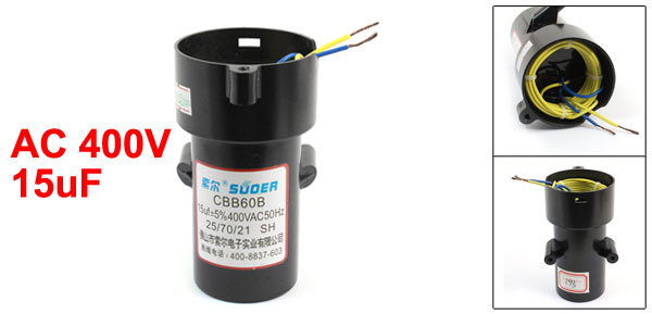 Product Name Motor Capacitor Housing Material Plastic Dielectric Material Polypropylene Film Model CBB60 Capacitance 15uF Tolerance ±5% Rated Voltage AC 400V Frequency 50Hz Body Size 6 x 11.5cm / 2.4" x 4.5" (D * H) Wire Length 16cm/6.3", 2.5M/8.2Ft Hole Diameter 3.5mm/0.14" Hole Distance 55mm/2.2" Bottom Inner Diameter 58mm/2.2" Color Yellow, Black Net Weight 218g Package Content 1 x Motor Capacitor - Reviews