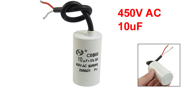 Product Name Motor Capacitor Housing Material Plastic Dielectric Material Metallized Polypropylene Film Model CBB60 Capacitance 10uF Tolerance +/-5% Ambient Temperature 25/70/21 Rated Voltage 450VAC Frequency 50/60Hz Body Size 3.4 x 6.2cm / 1.3" x 2.4" (D * H) Wire Length 16cm/6.3" Color White Net Weight 77g Package Content 1 x Motor Capacitor - Reviews