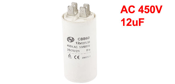 Product Name Motor Capacitor Model CBB60 Dielectric Material Polypropylene Film Housing Material Plastic Capacitance 12µF Tolerance ±5% Rated Frequency 50/60Hz Rated Voltage AC 450V Size 3.3 x 7cm/ 1.3" x 2.7" (Dia.*H) Pin Number 4 Color White Weight 63g Package Content 1 x Motor Capacitor - Reviews