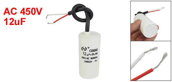 DetailsCBB60 AC 450V 12uF Cylindrical Non Polar Motor Capacitor  Product Name Motor Capacitor Housing Material Plastic Dielectric Material Metallized Polypropylene Film Model CBB60 Capacitance 12uF Tolerance +/-5% Ambient Temperature 25/70/21 Rated Voltage 450VAC Frequency 50/60Hz Body Size 3.3 x 7.2cm / 1.3" x 2.8" (D * H) Wire Length 15cm/5.9" Color White Net Weight 76g Package Content 1 x Motor Capacitor