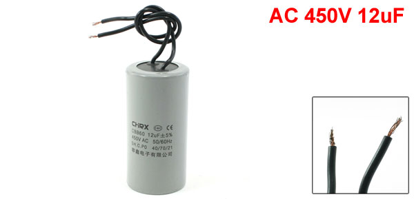 Product Name Motor Capacitor Housing Material Plastic Dielectric Material Metallized Polypropylene Film Model CBB60 Capacitance 12uF Tolerance +/-5% Ambient Temperature 40/70/21 Rated Voltage 450VAC Frequency 50/60Hz Body Size 3.7 x 7.5cm / 1.5" x 3" (D * H) Wire Length 14cm/5.5" Color Gray Net Weight 67g Package Content 1 x Motor Capacitor - Reviews