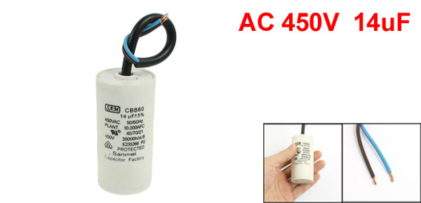 Product Name Motor Run Capacitor Model CBB60 Material Polypropylene Film Rated Capacitance 14uF Tolerance 5% Rated Frequency 50/60 Hz Rated Voltage 450V AC Cylinder Size 7 x 3.7cm/ 2.8" x 1.5"(H*D) Wire Length 15cm/ 5.9" Main Color White Weight 59g Package Content 1 x Motor Run Capacitor - Reviews