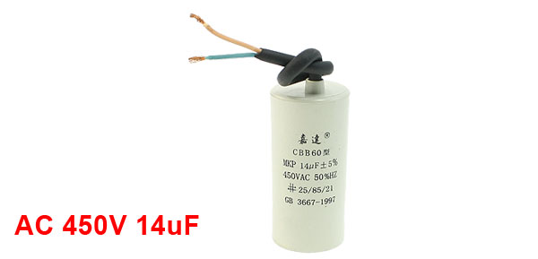 Product Name Motor Capacitor Housing Material Plastic Dielectric Material Metallized Polypropylene Film Model CBB60 Capacitance 14uF Tolerance ±5% Ambient Temperature 25/85/21 Rated Voltage 450VAC Frequency 50Hz Body Size 3.9 x 8.3cm / 1.5" x 3.3" (D * H) Wire Length 13cm/5.1" Color Gray Net Weight 90g Package Content 1 x Motor Capacitor  - Reviews