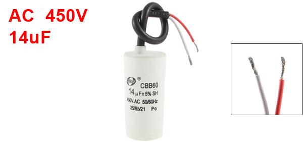 Product Name Motor Capacitor Housing Material Plastic Dielectric Material Polypropylene Model CBB60 Capacitance 14uF Tolerance +/-5% Rated Voltage 450VAC Frequency 50/60Hz Body Size 3.2 x 7.2cm/ 1.3" x 2.8" (D*H) Cable Length 19.5cm/ 7.7" Color White Weight 77g Package Content 1 x Motor Capacitor - Reviews