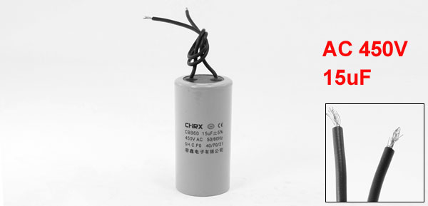 Product Name Motor Capacitor Housing Material Plastic Dielectric Material Metallized Polypropylene Film Model CBB60 Capacitance 15uF Tolerance +/-5% Ambient Temperature 40/70/21 Rated Voltage 450VAC Frequency 50/60Hz Body Size 3.7 x 7.5cm / 1.5" x 3" (D * H) Wire Length 13cm/5.1" Color Gray Net Weight 93g Package Content 1 x Motor Capacitor - Reviews