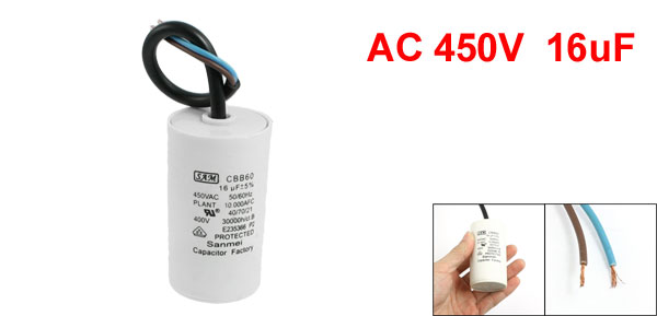 Product Name Motor Run Capacitor Model CBB60 Material Polypropylene Film Rated Capacitance 16uF Tolerance 5% Rated Frequency 50/60 Hz Rated Voltage 450V AC Cylinder Size 7 x 3.7cm/ 2.8" x 1.5"(H*D) Wire Length 16cm/ 6.3" Main Color White Weight 82g Package Content 1 x Motor Run Capacitor - Reviews