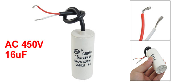 Product Name Motor Capacitor Housing Material Plastic Dielectric Material Metallized Polypropylene Film Model CBB60 Capacitance 16uF Tolerance ±5% Ambient Temperature 25/70/21 Rated Voltage 450VAC Frequency 50/60Hz Body Size 3.3 x 7.2cm / 1.3" x 2.8" (D * H) Wire Length 15cm/5.9" Color White Net Weight 75g Package Content 1 x Motor Capacitor - Reviews
