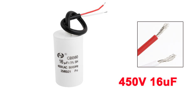 Product Name Polypropylene Film Capacitor Housing Material Plastic Dielectric Material Polypropylene Model CBB60 Capacitance 16uF Tolerance ±5% Rated Voltage 450V AC Frequency 50/60Hz Body Size 3.9 x 7.2cm / 1.5" x 2.8" (D*H) Cable Length 20cm/ 7.9" Color White, Black Weight 97g Package Content 1 x Polypropylene Film Capacitor - Reviews
