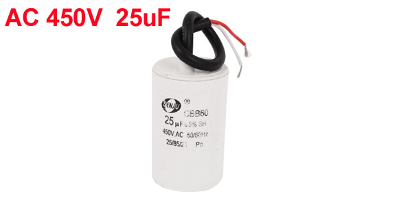 Product Name Motor Capacitor Housing Material Plastic Dielectric Material Metallized Polypropylene Film Model CBB60 Capacitance 25uF Tolerance +/-5% Ambient Temperature 25/85/21 Rated Voltage AC 450V Frequency 50/60Hz Body Size 4.4 x 7cm / 1.7" x 2.8" (D * H) Wire Length 20cm/8" Color White Net Weight 126g Package Content 1 x Motor Capacitor - Reviews