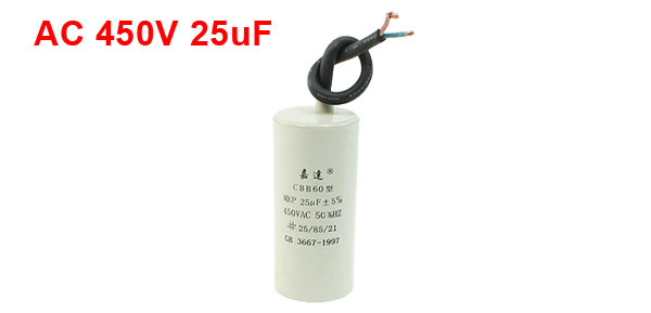 Product Name Motor Capacitor Housing Material Plastic Dielectric Material Metallized Polypropylene Film Model CBB60 Capacitance 25uF Tolerance ±5% Ambient Temperature 25/85/21 Rated Voltage 450VAC Frequency 50Hz Body Size 4.4 x 9.7cm / 1.7" x 3.8" (D * H) Wire Length 15cm/5.9" Color Gray Net Weight 150g Package Content 1 x Motor Capacitor - Reviews