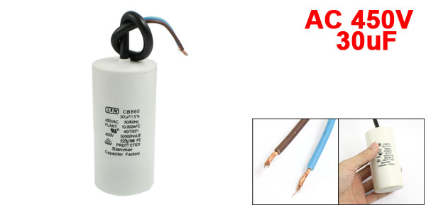 Product Name Motor Capacitor Model CBB60 Material(External) Plastic Rated Capacitance 30uF Tolerance ±5% Rated Frequency 50/60Hz Rated Voltage AC 450V Size 9.2 x 4.4cm / 3.6" x 1.7" (L * D) Cable Length 18cm / 7" Main Color White Weight 43g Package Content 1 x Motor Capacitor - Reviews
