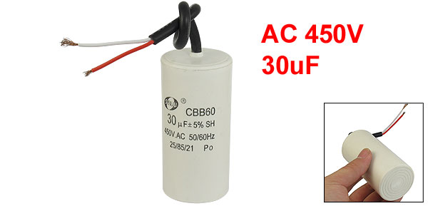 Product Name Motor Capacitor Housing Material Plastic Dielectric Material Metallized Polypropylene Film Model CBB60 Capacitance 30uF Tolerance ±5% Ambient Temperature 25/70/21 Rated Voltage 450VAC Frequency 50/60Hz Body Size 4.4 x 9.2cm / 1.7" x 3.6" (D * H) Wire Length 16cm/6.3" Color White Net Weight 155g Package Content 1 x Motor Capacitor - Reviews