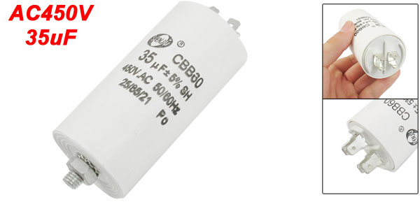 Product Name Motor Capacitor Model CBB60 Dielectric Material Polypropylene Film Housing Material Plastic Capacitance 35µF Tolerance 5% Rated Frequency 50/60Hz Rated Voltage AC 450V Size 4.5 x 11.5cm/ 1.77" x 4.53" (Dia.*H) Thread Diameter 8mm/ 0.31" Color White Weight 154g Package Content 1 x Motor Capacitor - Reviews
