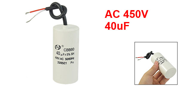 DetailsCBB60 AC 450V 40uF Cylinder Shaped Non Polar Motor Capacitor  Product Name Motor Capacitor Housing Material Plastic Dielectric Material Metallized Polypropylene Film Model CBB60 Capacitance 40uF Tolerance ±5% Rated Voltage 450VAC Frequency 50/60Hz Body Size 49 x 100mm / 1.9" x 3.9" (D * H) Wire Length 15cm/5.9" Color Gray Net Weight 165g Package Content 1 x Motor Capacitor