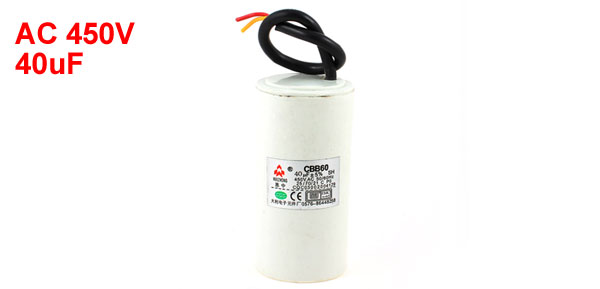 Product Name Motor Capacitor Housing Material Plastic Dielectric Material Metallized Polypropylene Film Model CBB60 Capacitance 40uF Tolerance ±5% Ambient Temperature 25/70/21 Rated Voltage 450VAC Frequency 50/60Hz Body Size 4.9 x 10cm / 1.9" x 3.9" (D * H) Wire Length 19cm/7.5" Color White, Black Net Weight 209g Package Content 1 x Motor Capacitor - Reviews