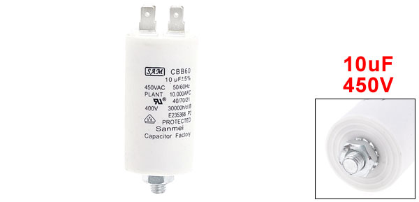 Product Name Motor Capacitor Model CBB60 Dielectric Material Polypropylene Film Housing Material Plastic Capacitance 10µF Tolerance ±5% Rated Frequency 50/60Hz Rated Voltage AC 450V Climate Type 40/70/21 Size 4 x 8.3cm/ 1.6" x 3.27" (Dia.*H) Thread Diameter 8mm/ 0.31" Color White Weight 42g Package Content 1 x Motor Capacitor - Reviews