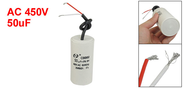 Product Name Motor Capacitor Housing Material Plastic Dielectric Material Metallized Polypropylene Film Model CBB60 Capacitance 50uF Tolerance +/-5% Ambient Temperature 25/70/21 Rated Voltage 450VAC Frequency 50/60Hz Body Size 4.8 x 10cm / 1.8" x 3.9" (D * H) Wire Length 15cm/5.9" Color White Net Weight 216g Package Content 1 x Motor Capacitor - Reviews