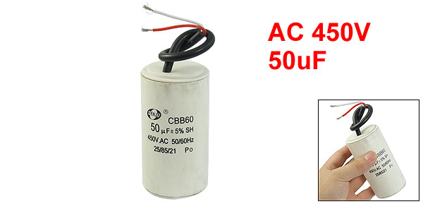 Product Name Motor Capacitor Housing Material Plastic Dielectric Material Metallized Polypropylene Film Model CBB60 Capacitance 50uF Tolerance ±5% Rated Voltage 450VAC Frequency 50/60Hz Body Size 49 x 97cm / 1.9" x 3.8" (D * H) Wire Length 15cm/5.9" Color Gray Net Weight 185g Package Content 1 x Motor Capacitor - Reviews