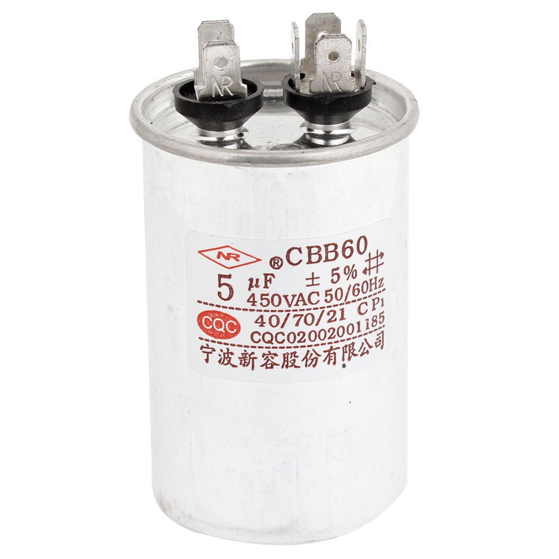 Product Name Motor Capacitor Material Polypropylene Model CBB60 Capacitance 5uF Rated Voltage AC 450V Tolerance ±5% Frequency 50/ 60Hz Operating Temperature 40/70/21 Body Dimension 4.5 x 7.2cm/ 1.8" x 2.8" (D*H) Total Length 8.4cm/ 3.3" Color Silver Tone Weight 132g Package Content 1 x Motor Capacitor - Reviews