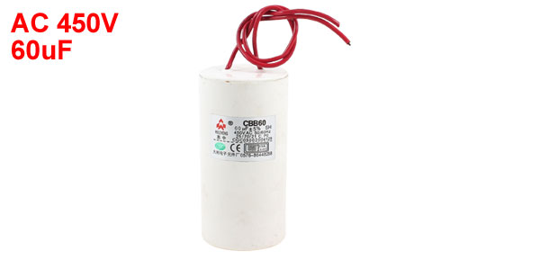 Product Name Motor Capacitor Housing Material Plastic Dielectric Material Metallized Polypropylene Film Model CBB60 Capacitance 60uF Tolerance ±5% Ambient Temperature 25/70/21 Rated Voltage 450VAC Frequency 50/60Hz Body Size 5 x 10cm / 2" x 3.9" (D * H) Wire Length 18cm/7.1" Color White, Red Net Weight 189g Package Content 1 x Motor Capacitor - Reviews