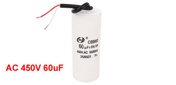 DetailsCBB60 AC 450V 60uF Polypropylene Film Motor Run Capacitor for Washing Machine  Product Name Motor Capacitor Housing Material Plastic Dielectric Material Polypropylene Film Model CBB60 Capacitance 60uF Tolerance +/-5% Rated Voltage AC 450V Frequency 50/60Hz Temperature Coefficient 25/85/21 Body Size 13 x 5cm / 5" x 2"(H*D) Wire Length 20cm / 8" Color White , Black Weight 230g Package Content 1 x Motor Capacitor