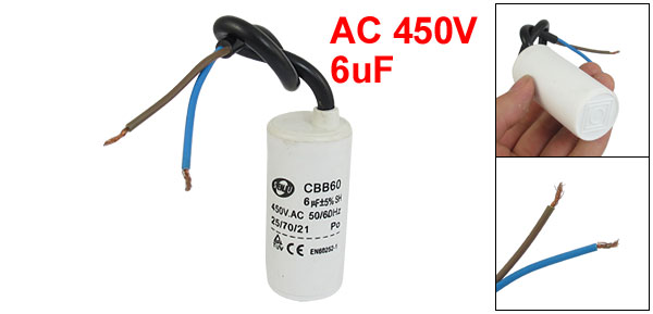 Product Name Motor Capacitor Housing Material Plastic Dielectric Material Metallized Polypropylene Film Model CBB60 Capacitance 6uF Tolerance +/-5% Ambient Temperature 25/70/21 Rated Voltage 450VAC Frequency 50/60Hz Body Size 2.8 x 6.4cm / 1.1" x 2.5" (D * H) Wire Length 15cm/5.9" Color White Net Weight 56g Package Content 1 x Motor Capacitor - Reviews