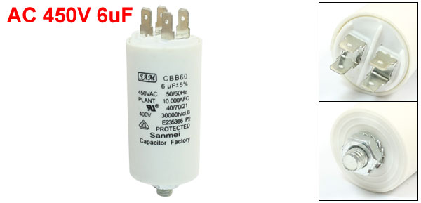 Product Name Motor Capacitor Material Polypropylene Film Model CBB60 Capacitance 6uF Tolerance ±5% Rated Voltage AC 450V Frequency 50/60Hz Operating Temperature 40/70/21 Body Size 34 x 68mm/ 1.3" x 2.7"(D*H) Total Length 92mm/ 3.6" Color Off White Weight 78g Package Content 1 x Motor Capacitor - Reviews