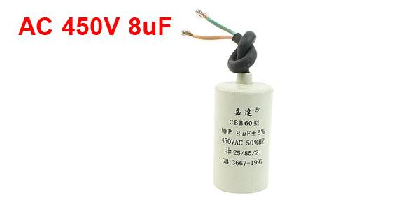 Product Name Motor Capacitor Housing Material Plastic Dielectric Material Metallized Polypropylene Film Model CBB60 Capacitance 8uF Tolerance ±5% Ambient Temperature 25/85/21 Rated Voltage 450VAC Frequency 50Hz Body Size 3.5 x 6.3cm / 1.4" x 2.5" (D * H) Wire Length 12cm/4.7" Color Gray Net Weight 61g Package Content 1 x Motor Capacitor - Reviews