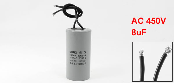Product Name Motor Capacitor Housing Material Plastic Dielectric Material Metallized Polypropylene Film Model CBB60 Capacitance 8uF Tolerance +/-5% Ambient Temperature 40/70/21 Rated Voltage 450VAC Frequency 50/60Hz Body Size 3.7 x 7.5cm / 1.5" x 3" (D * H) Wire Length 14cm/5.5" Color Gray Net Weight 64g Package Content 1 x Motor Capacitor - Reviews