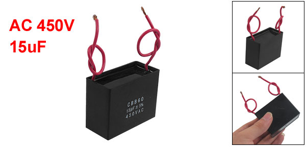 Product Name Motor Capacitor Model CBB60 Material Metallized Polypropylene Film Rated Capacitance 15uF Tolerance ±5% Rated Voltage AC 450V Size 5.8 x 4.5 x 2.7cm/ 2.3" x 1.8" x 1.1"(L*W*H) Cable Length 12cm/ 4.7" Main Color Black Weight 68g Package Content 1 x Motor Capacitor - Reviews