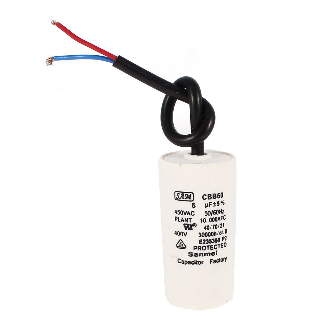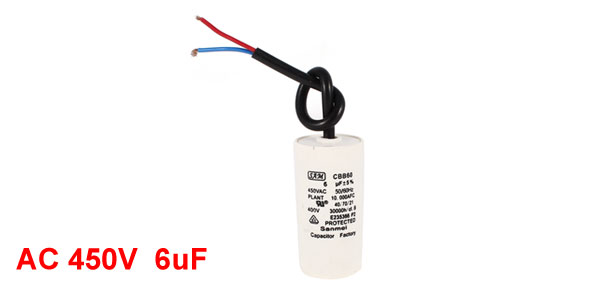 Terminal Wire Ambient Temperature 40/70/21 Rated Capacitance 6uF Tolerance ±5% Rated Frequency 50/60Hz Rated Voltage 450V AC Size 3 x 7cm/ 1.2" x 2.7" (D*H) Wire Length 18cm/ 7.1" Main Color White Net Weight 57g Package Content 1 x Motor Capacitor - Reviews