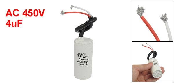 Product Name Motor Capacitor Housing Material Plastic Dielectric Material Metallized Polypropylene Film Model CBB60 Capacitance 4uF Tolerance ±5% Ambient Temperature 25/70/21 Rated Voltage 450VAC Frequency 50/60Hz Body Size 2.8 x 6.4cm / 1.1" x 2.5" (D * H) Wire Length 15cm/5.9" Color White Net Weight 60g Package Content 1 x Motor Capacitor - Reviews