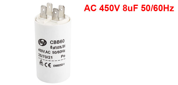 Product Name Motor Capacitor Material Polypropylene Film Model CBB60 Capacitance 8uF Tolerance ±5% Rated Voltage AC 450V Frequency 50/60Hz Body Size 35 x 65mm/ 1.4" x 2..5" (D * H) Color White Weight 58g Package Content 1 x Motor Capacitor - Reviews