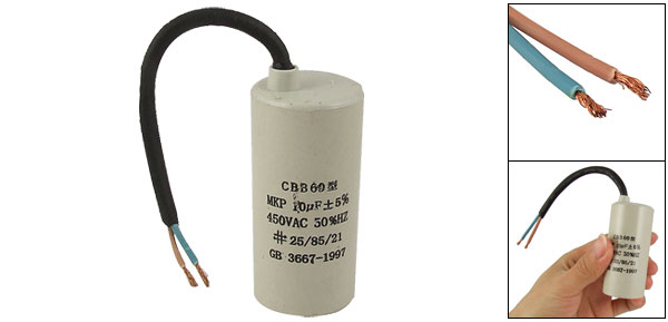 Product Name Motor Capacitor Housing Material Plastic Dielectric Material Polypropylene Model CBB60 Capacitance 10uF(10MFD) Tolerance +/-5% Rated Voltage 450VAC Frequency 50Hz Body Size 3.4 x 7.2cm / 1.33" x 2.83" (D * H) Wire Size(Approx.) 23 x 0.6cm / 9" x 0.23" (L * Max.D) Color As Picture Shown Weight 58g Package Content 1 x Motor Capacitor - Reviews