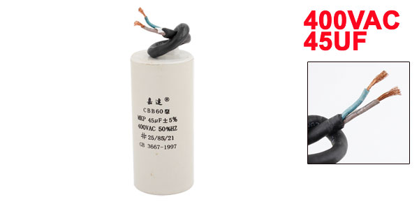 Product Name Motor Run Capacitor Model CBB60 Rated Capacitance 45uF Tolerance ±5% Rated Voltage 400V AC Frequency 50/60Hz Body Size 9.7 x 4.5cm / 3.8" x 1.8"(H*D) Wire Length 18cm / 6.7" Main Material Polypropylene Film, PVC Main Color Beige Weight 124g Package Content 1 x Motor Run Capacitor - Reviews